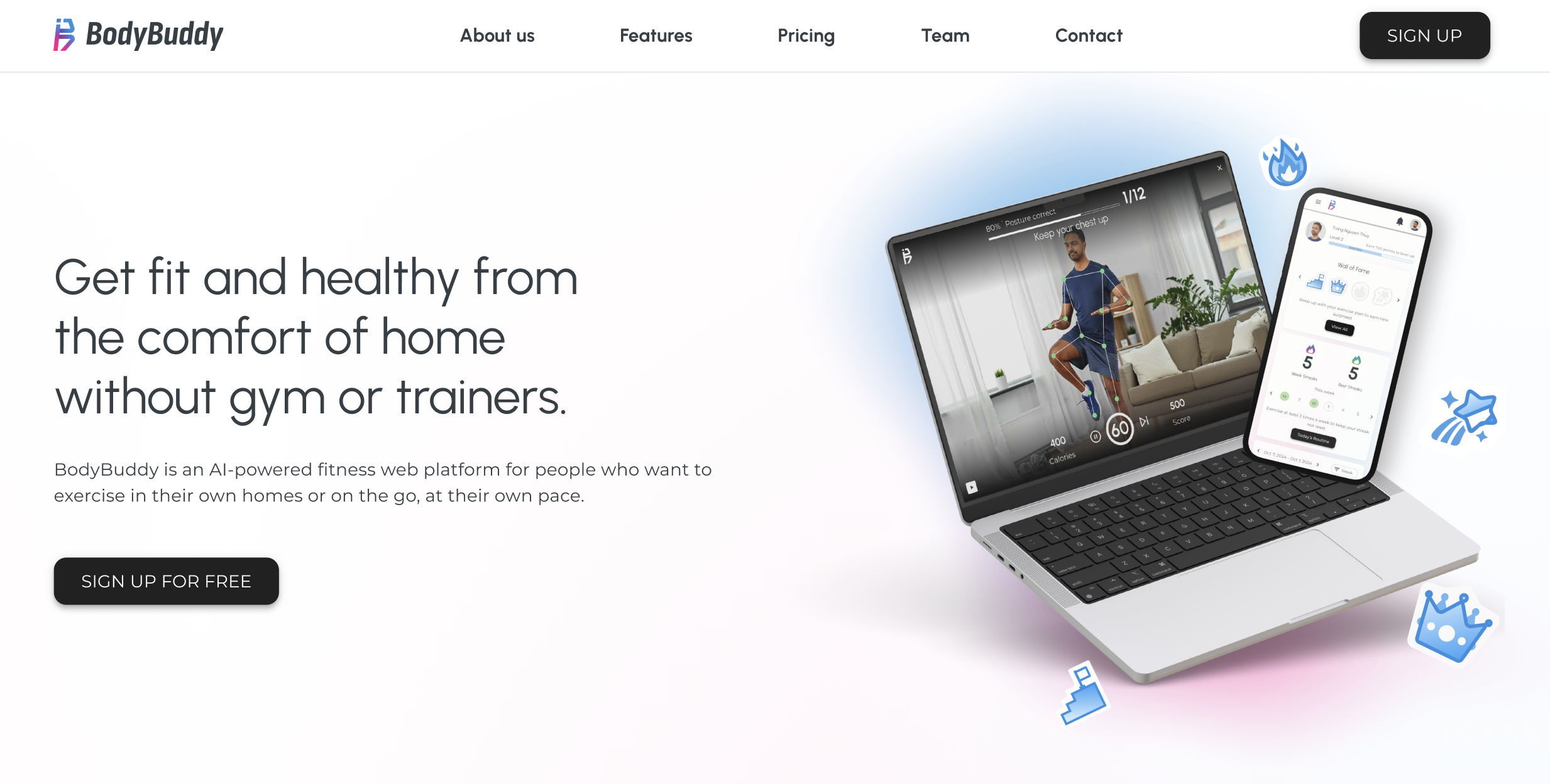 BodyBuddy is a home-fitness app that helps beginners exercise with confidence using real-time motion tracking and personalized training programs. For this project, I designed a conversion-focused landing page that introduces the product, communicates its value, and guides users toward downloading the app.